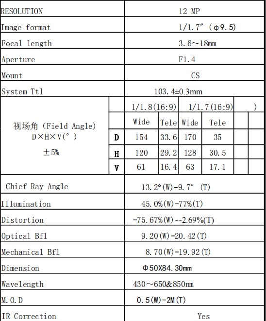 MJOPTC lens Zoom lens F/NO1.6 EFL3.8-18DC Suitable for monitoring at zoom distance, outdoor monitoring